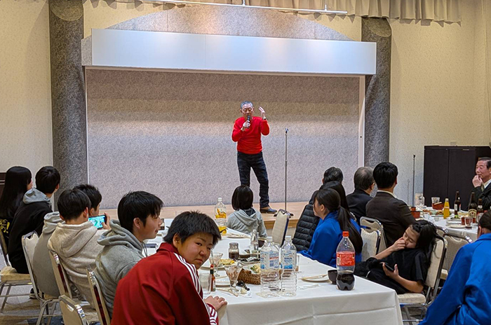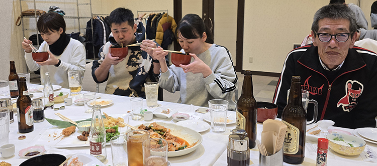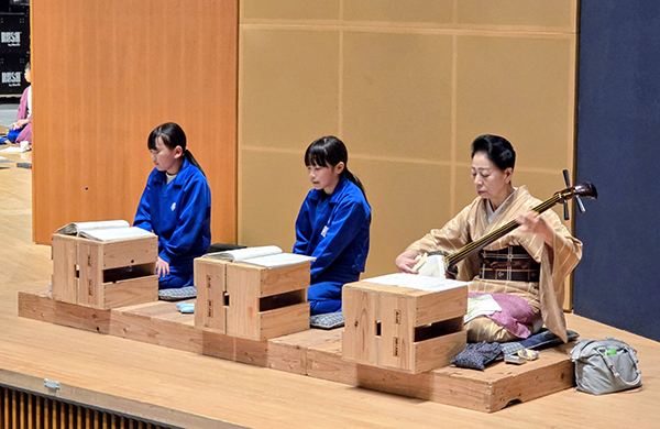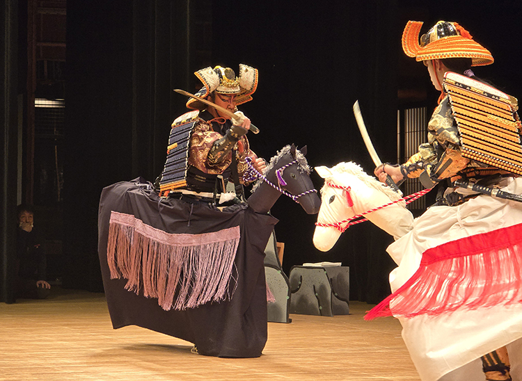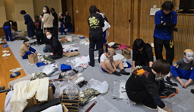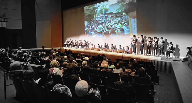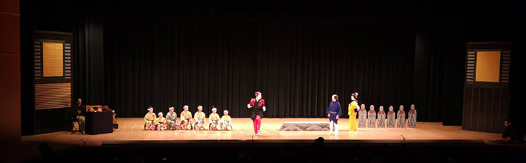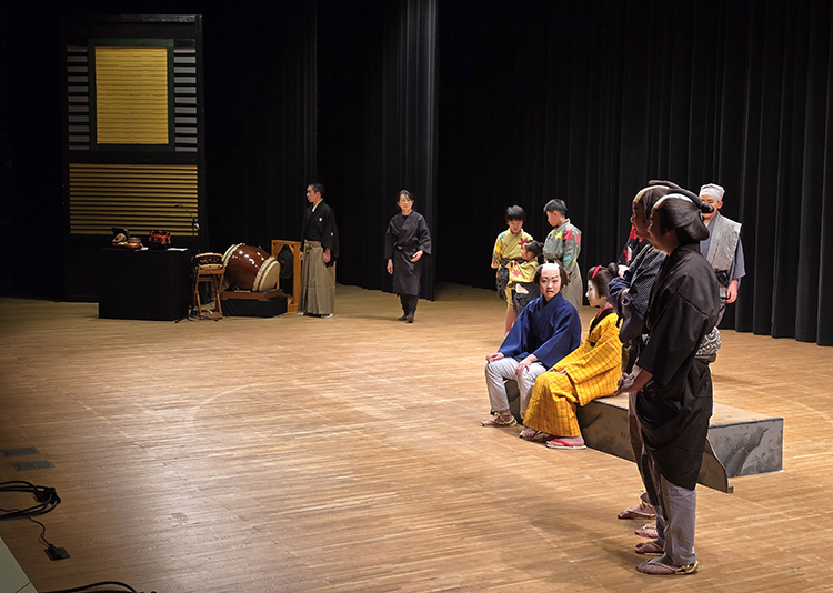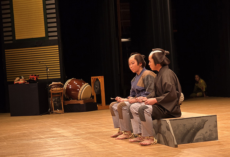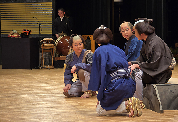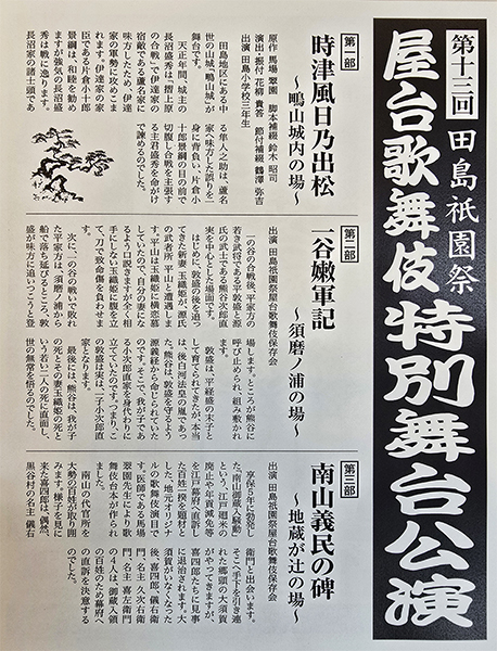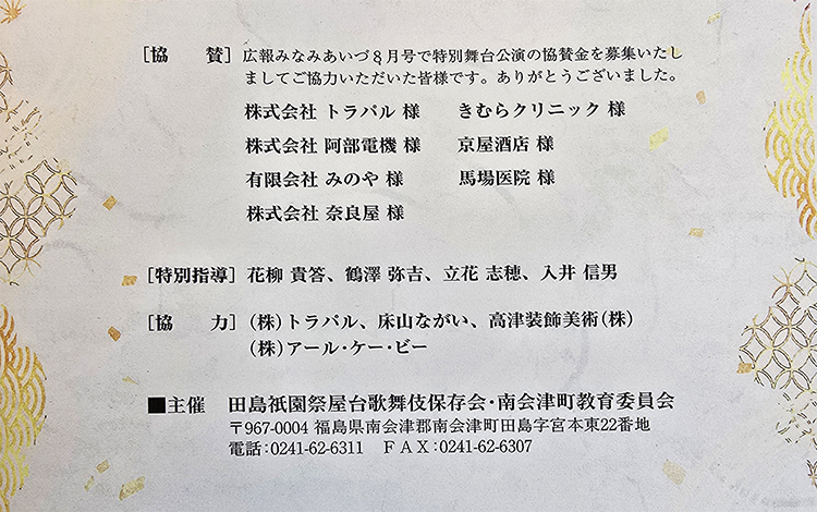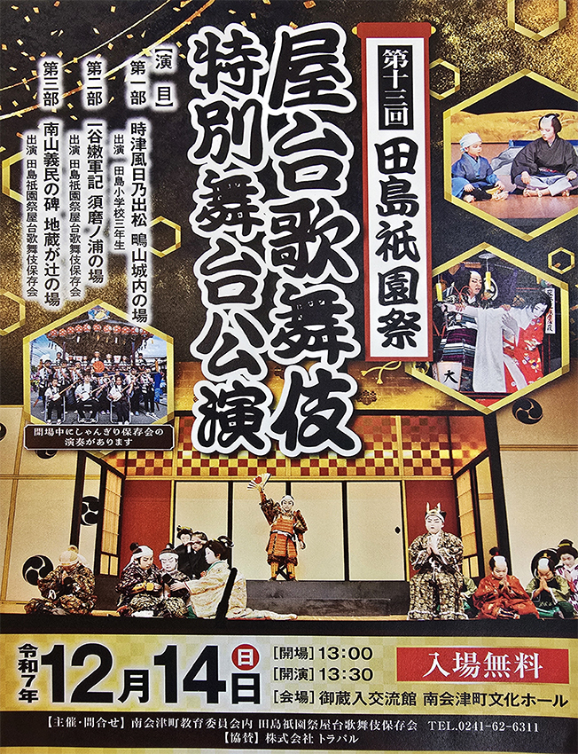 平成26年から「田島祇園祭屋台歌舞伎 特別舞台公演」と銘打ち、南会津町の御蔵入交流館の本格的な舞台で発表をしています。本年度の演目は昨年と同じく地元ゆかりの作家、馬場翠園作の「時津風日の出の松」。役者、鳴りもの、太夫、附け打ち、小道具と全員がそれぞれの役割を受け持ち、田島を舞台にした演目に取り組みました。